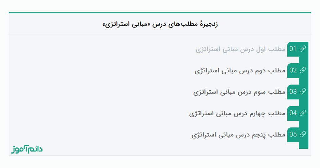 ۱- ترجیح و توصیهی دائمآموز این است که برای یادگیریِ بهتر درسها، از اولین مطلبِ زنجیره شروع کنید و بهتدریج مطلبهای بعدی را مطالعه کنید. چراکه هر مطلب پیشنیاز مطلبهای بعد از خودش است و رعایت کردن ترتیبِ مطالعه میتواند درک شما را عمیقتر و یادگیری شما را اثربخشتر کند.