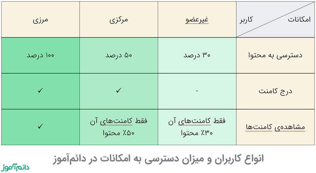 راهنمای مربوط به انواع کاربران و میزان دسترسی به امکانات در دائمآموز